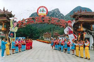广西刘三姐景观园,她是以刘三姐文化、广西壮族文化及民俗民风为主题的休闲游乐场所。 步入景观园,广西壮、瑶、侗、苗的少男少女歌舞相迎,跳过竹竿舞,您会步步高升;迎面的水上对歌台,游客可一舒歌喉与美丽的刘三姐对歌比试,被三姐相中的幸运游客还可得到抛出的绣球;寨楼风情是游客参与性节目,游客在这里能身临其境地感受广西少数民族的婚礼习俗;去到莫府、阿牛家不仅感受到电影《刘三姐》场面的再现,上刀山、下火海绝技,斗鸡等表演会让游客看得更开心,大饱眼福。 >> 详细介绍