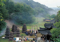 绍兴射雕村,“射雕村”三字,这是金庸先生的手笔。牛家村;从入口进走过一段石板路,就是“牛家村”。村口有一射雕英雄青铜像;村内设有曲三酒店、街面店铺等;过小石桥还有一大水车,这是江南曾经常见、现已消失的水碓、磨房,年糕就是在这里加工而成,游客可掺一包酥糖或榨菜做馅,慢慢品尝这一民间美食-糕花;村子的空地还时常有坐花轿、拉大片、斗鸡等民间杂耍表演;村内还有郭啸天和杨铁心的家院,青瓦屋是主屋,墙中有一门相通。 >> 详细介绍