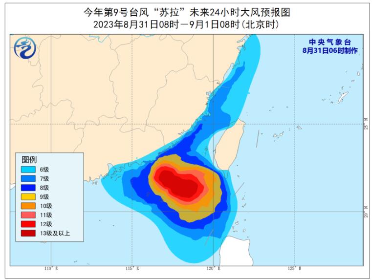 大风预报:8月31日08时至9月1日08时,巴士海峡、台湾海峡、南海东北部、福建沿海、广东中东部沿海、台湾岛南部沿海、东沙群岛将有6-8级、阵风9-10级的大风,其中巴士海峡偏西海域、南海东北部海域、东沙群岛的风力有9-11级,部分海域风力可达12-13级,“苏拉”中心经过的附近海面风力有14-17级、阵风17级以上。