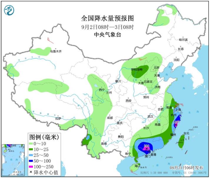 全国降水量预报图(9月2日08时-3日08时)