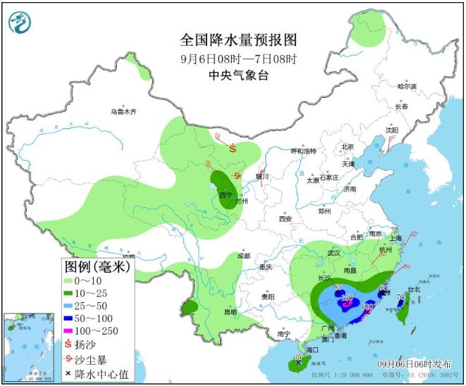 9月6日08时至7日08时,青海东部、福建大部、广东中东部、江西中南部、湖南东南部、海南岛大部、台湾岛等地部分地区有中到大雨,其中,福建东部和南部、广东东北部和东南部沿海、江西南部、台湾岛西北部等地部分地区有暴雨到大暴雨(100~180毫米)。内蒙古西北部、辽东半岛、甘肃河西、宁夏北部、浙江中部等地部分地区有4~6级风。内蒙古西部、甘肃河西局地有扬沙或沙尘暴。